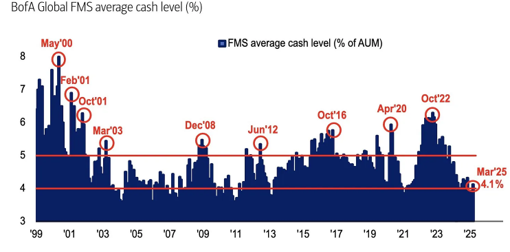 Ekonómovia z Goldman Sachs zvýšili svoje očakávania recesie v USA v nasledujúcom roku na 20 % z predchádzajúcich 15 %, pričom uviedli potenciálne clá a neistotu obchodnej politiky. Tieto obavy potvrdzuje aj marcový prieskum Bank of America, ktorý odhalil, že 55 % správcov fondov teraz považuje globálnu recesiu za najväčšie riziko. Navyše, prieskum ukázal, že úrovne hotovosti vzrástli na 4,1 % z 3,5 % vo februári, čo predstavuje najvyššiu úroveň od roku 2010 a signalizuje klasický únik k bezpečiu.