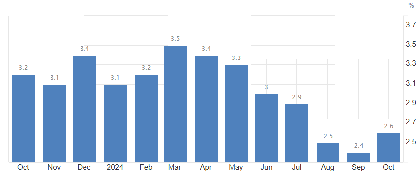 Podľa údajov Trading Economics je inflácia v USA v čase písania na úrovni 2,6 % za október 2024. Za posledné mesiace sa centrálna banka priblížila k inflačnému cieľu 2 % zrejme najbližšie. Celý rok totiž pozorujeme, ako tempo rastu cien osciluje okolo hladiny 3 %.