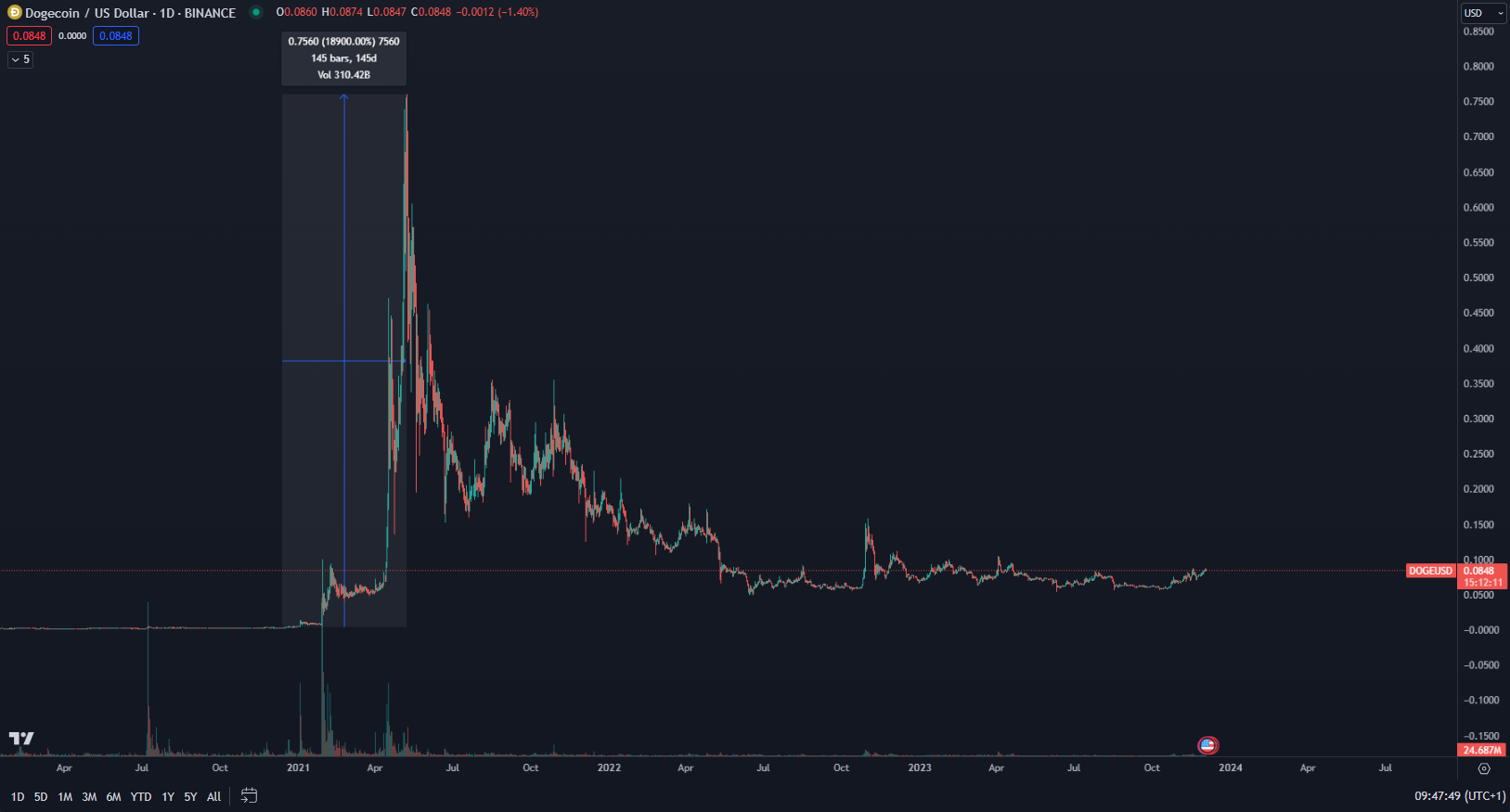 Kým sa Elon Musk nezačal zaujímať o Dogecoin, túto kryptomenu nemal nikto záujem nakupovať. Ešte do decembra 2020 sa DOGE obchodoval na cene 0,004 dolára. To, čo prišlo potom, sa vidí len zriedka. Len niekoľko mesiacov na to, v máji 2021, DOGE dosiahol doteraz najvyššiu cenu 0,76 dolára. Hovoríme o niekoľkomesačnom vzostupe so ziskom približne 19 000 %.