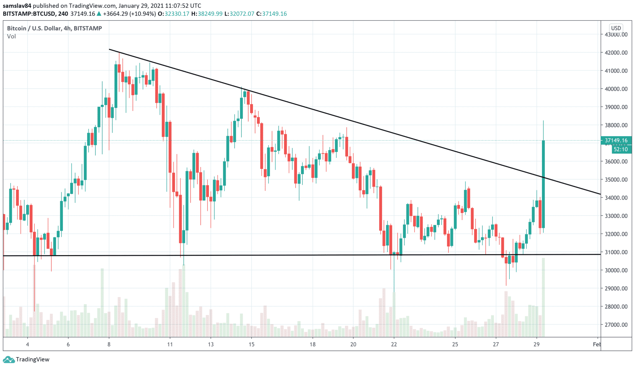 Bitcoin vytvoril vyššie high a zol cenu 38 300 $, kde sa momentálne nachádza nepríjemná rezistencia. Aktuálne sa pohybujeme o 1700 $ nižšie. Pekné… ale bude to stačiť na otočku a rozpútanie ďalšieho bullrunu?