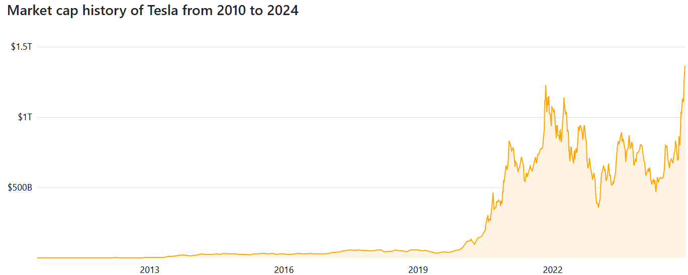 Tesla je podľa rebríčka CompaniesMarketCap 8. najväčšia firma na svete s celkovou trhovou kapitalizáciou 1,36 bilióna dolárov. Za rok 2024 zatiaľ dosiahla výnos 97,15 miliárd dolárov a zisk 8,73 miliárd dolárov.