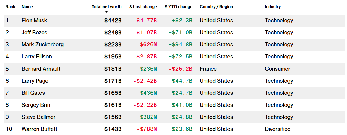 Na druhom mieste je po Muskovi Jeff Bezos s majetkom 248 miliárd dolárov, nasleduje Mark Zuckerberg (223 miliárd dolárov), Larry Ellison (195 miliárd dolárov) a Bernard Arnault (181 miliárd dolárov).