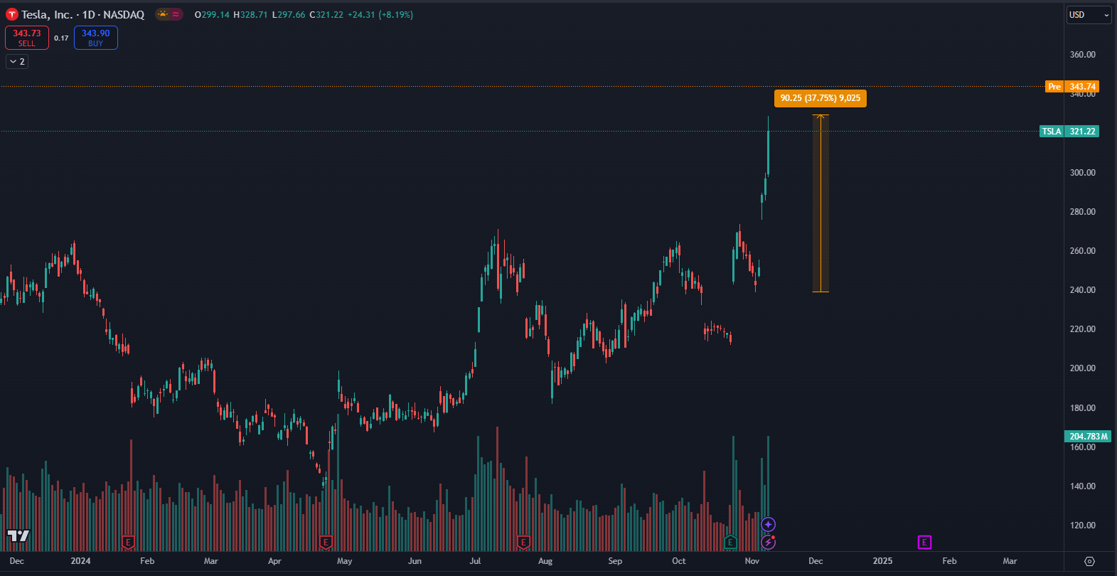 Akcie automobilky po prezidentských voľbách zaznamenali prudký nárast o impozantných 15 %, čím podľa údajov TradingView dosiahli novú cenu 322 dolárov za akciu. To automaticky zvýšilo celkovú hodnotu Muskových akcií o ohromujúcich 15 miliárd dolárov v priebehu jediného obchodného dňa.
