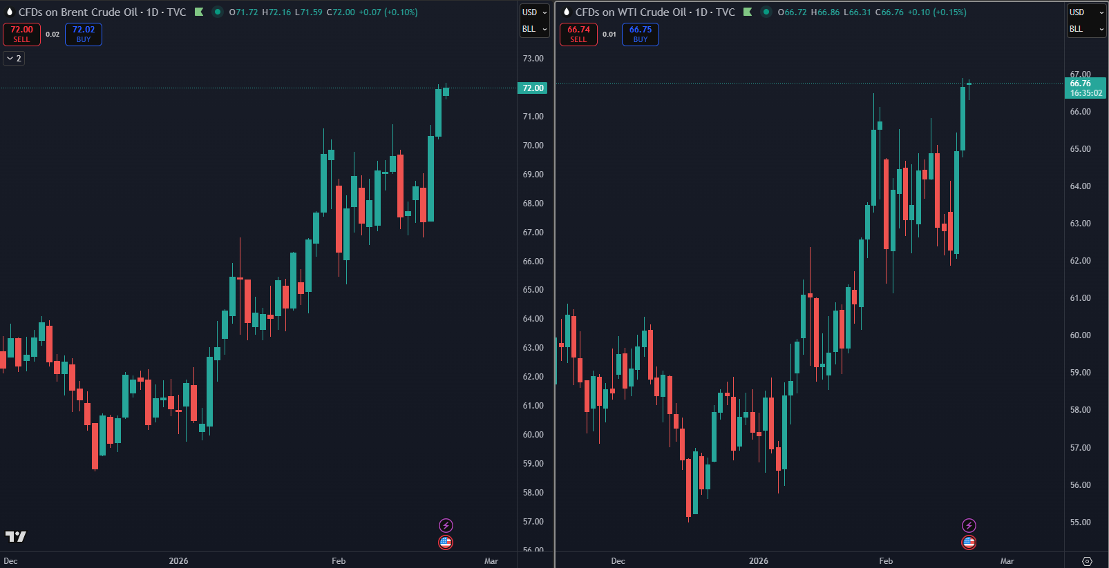 Podľa údajov portálu TradingView ceny ropy v piatok rastú a smerovali k prvému týždennému zisku za tri týždne. Trh reagoval na rastúce napätie medzi USA a Iránom po vyjadreniach prezidenta Donald Trump, ktorý varoval, že ak Teherán neuzavrie dohodu o jadrovom programe do 10 až 15 dní, nastanú „naozaj zlé veci”, uviedla PBS News.