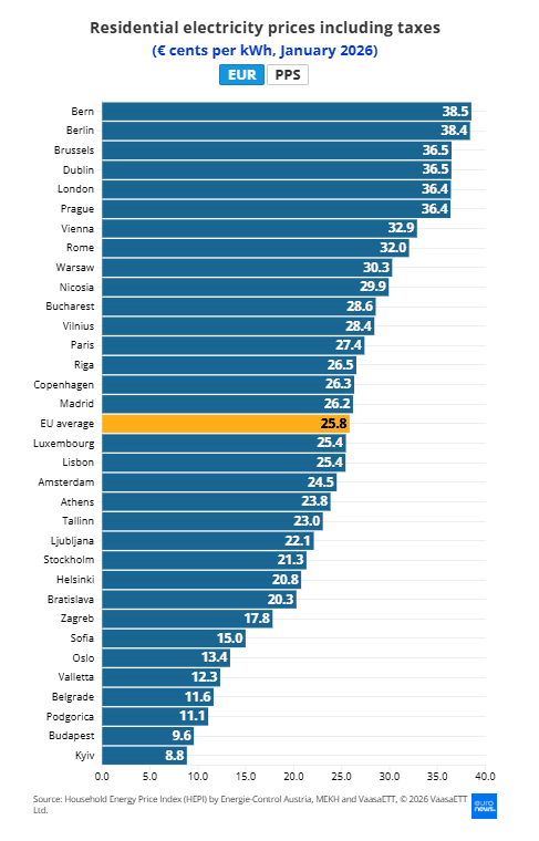 Začiatkom januára 2026 dosiahli koncové ceny elektriny pre domácnosti rozpätie od 8,8 c€/kWh v Kyjeve po 38,5 c€/kWh v Berne. Priemer EÚ predstavoval 25,8 c€/kWh. Medzi najdrahšie mestá patrili Berlín, Brusel, Dublin, Londýn a Praha.
