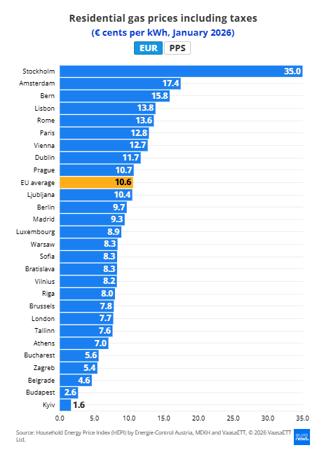Ešte výraznejšie rozdiely vidno pri cenách zemného plynu. V januári 2026 zaplatili domácnosti v Kyjeve 1,6 c€/kWh, zatiaľ čo v Štokholme až 35 c€/kWh. V rámci EÚ ide o viac než 13-násobný rozdiel oproti Budapešti, kde plyn stojí 2,6 c€/kWh.