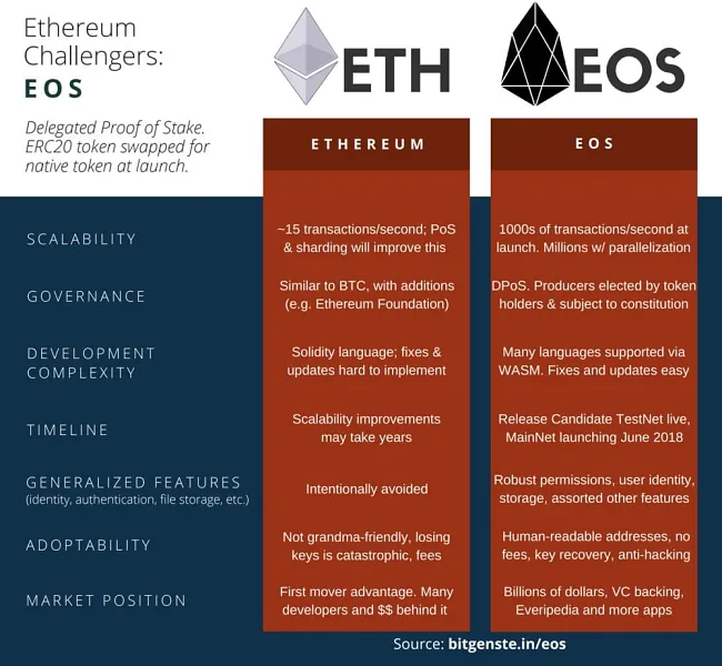 EOS je relatívne nový projekt (založený v júni 2017), ktorý je navrhnutý na podporu decentralizovaných aplikácií prostredníctvom inteligentných zmlúv v komerčnom meradle. Jeho primárnym cieľom je umožniť spoločnostiam vytvárať aplikácie bežiace na blockchain platforme podobným spôsobom ako webové aplikácie. Vývojári EOSu očakávajú, že ich platforma časom spracuje aspoň 1000 transakcií za sekundu. Naproti tomu, jeden z hlavných konkurentov tejto meny, Ethereum, dokáže súčasnosti spracovať len približne 15 transakcií za sekundu.