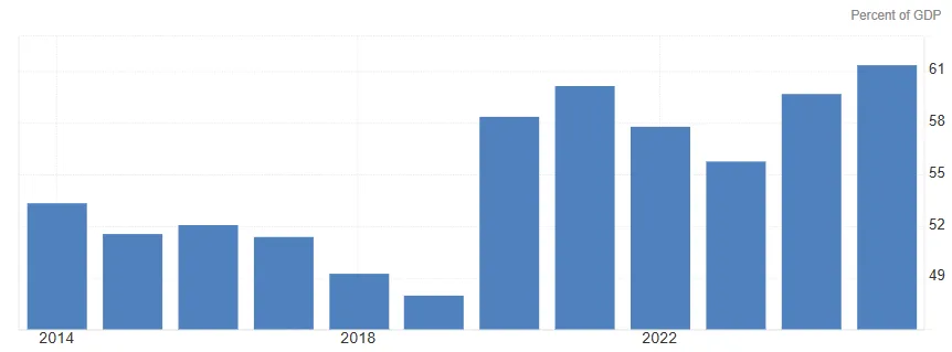 Slovenský dlh stúpol na 61,4 % HDP, čím prekročil referenčnú hranicu 60 %, zatiaľ čo priemerný dlh v celej Európskej únii dosiahol úroveň 81,7 % .