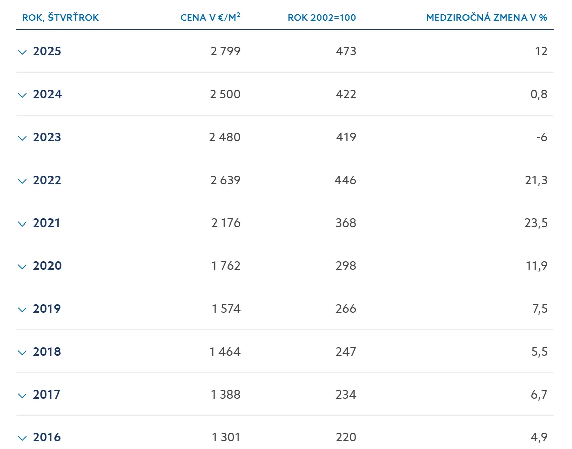 Nehnuteľnosti na Slovensku zaznamenali za posledných desať rokov výrazný rast cien. Podľa údajov Národnej banky Slovenska byt v hodnote 150 000 eur v roku 2016 dosiahol dnes cenu približne 338 732 eur. To predstavuje zhodnotenie o 125,8 % za 10 rokov — výsledok porovnateľný s ETF, avšak s výrazne odlišným priebehom a podmienkami.