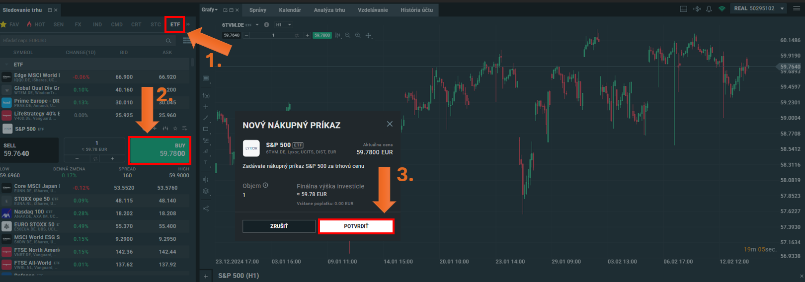 - Vyberiete si konkrétne ETF, sumu a kliknete na nákup