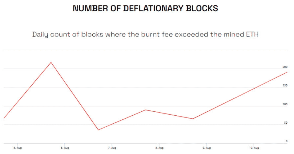 Keď je množstvo spáleného Etherea väčšie ako odmena za ťažbu, vytvoria sa deflačné bloky a ponuka sa dočasne zníži. Doposiaľ bolo 791 deflačných blokov, kde spálený poplatok presiahol vyťažené Ethereum.