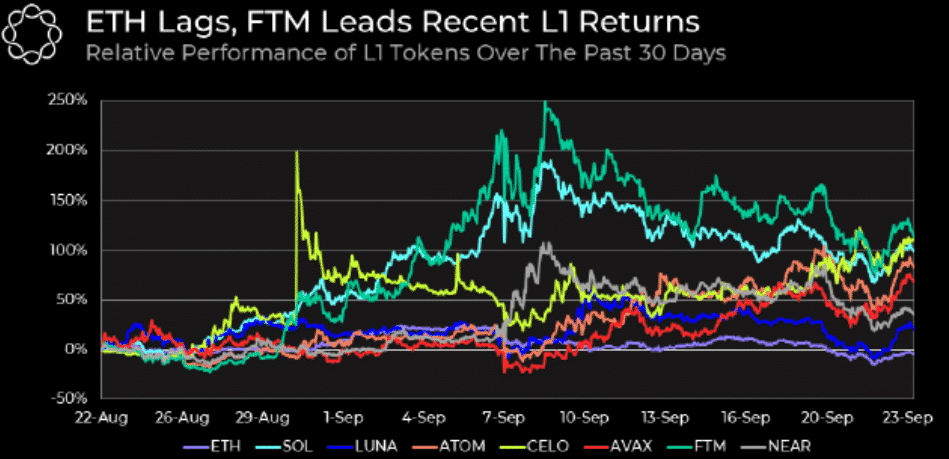 Podľa nedávnej správy spoločnosti Delphi Digital cena ETH zostala za posledný mesiac relatívne rovná. Konkurenti ako Solana (SOL) a Fantom (FTM) zaznamenali v rovnakom čase nárast cien o viac ako 200 %.