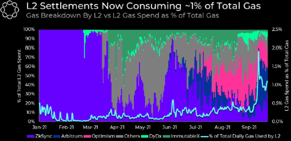 Údaje spoločnosti Delphi Digital ukazujú, že percento plynu použitého v riešeniach vrstiev 2 je teraz vyššie ako 1 % po zvýšení, a až o 2 % na začiatku septembra.