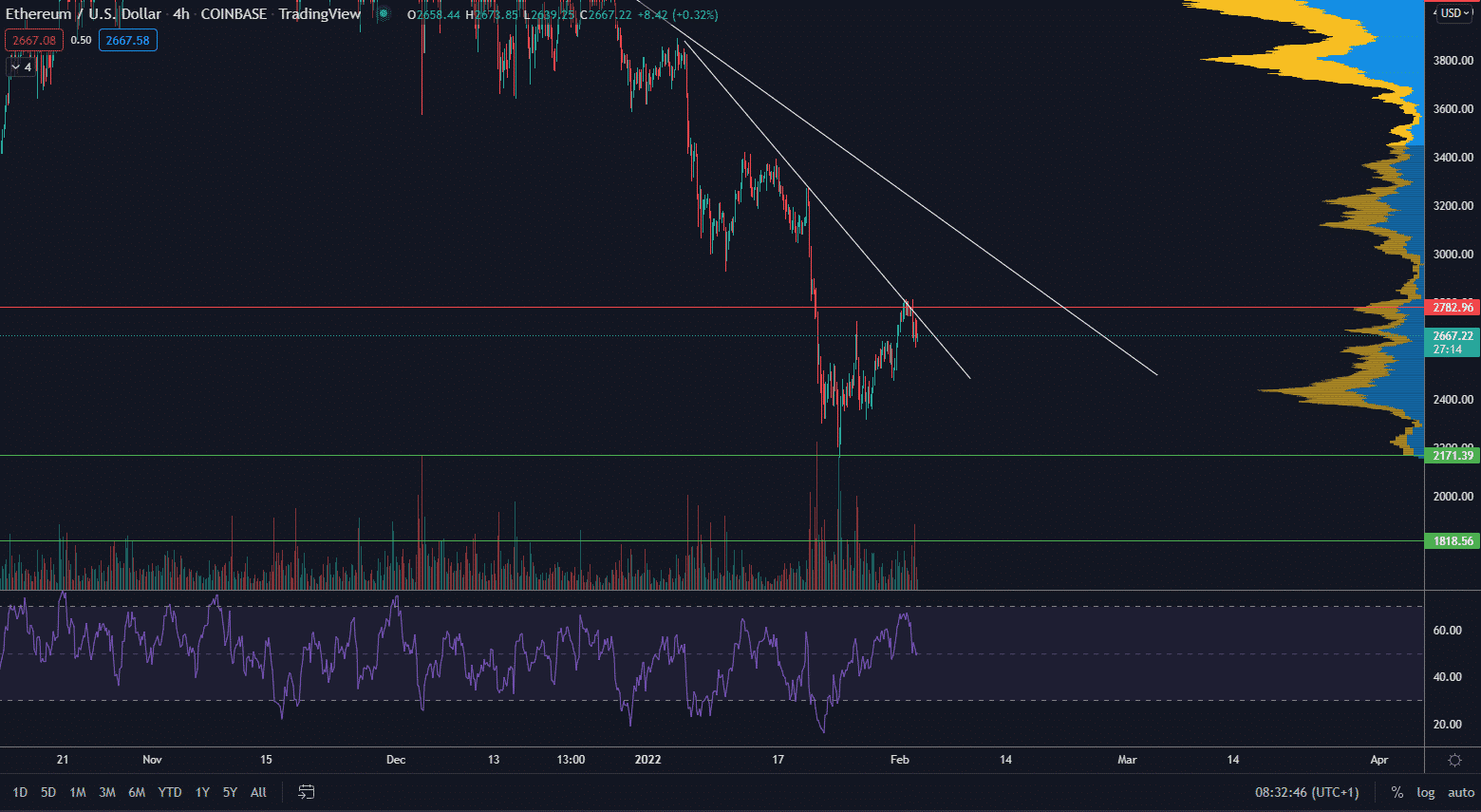 Posledná rezistencia bola rešpektovaná na hladine 2 800 $, kde sa nachádza rezistencia z maxím korekčného legu. Cena tak krátkodobo klesá, aj keď krátkodobé minima sú rastúce. Ďalšie minimum by sa malo vytvoriť nad hladinou 2 200 $, ak chceme pomýšľať nad reverziou trendu alebo nad potenciálnym dnom korekcie.