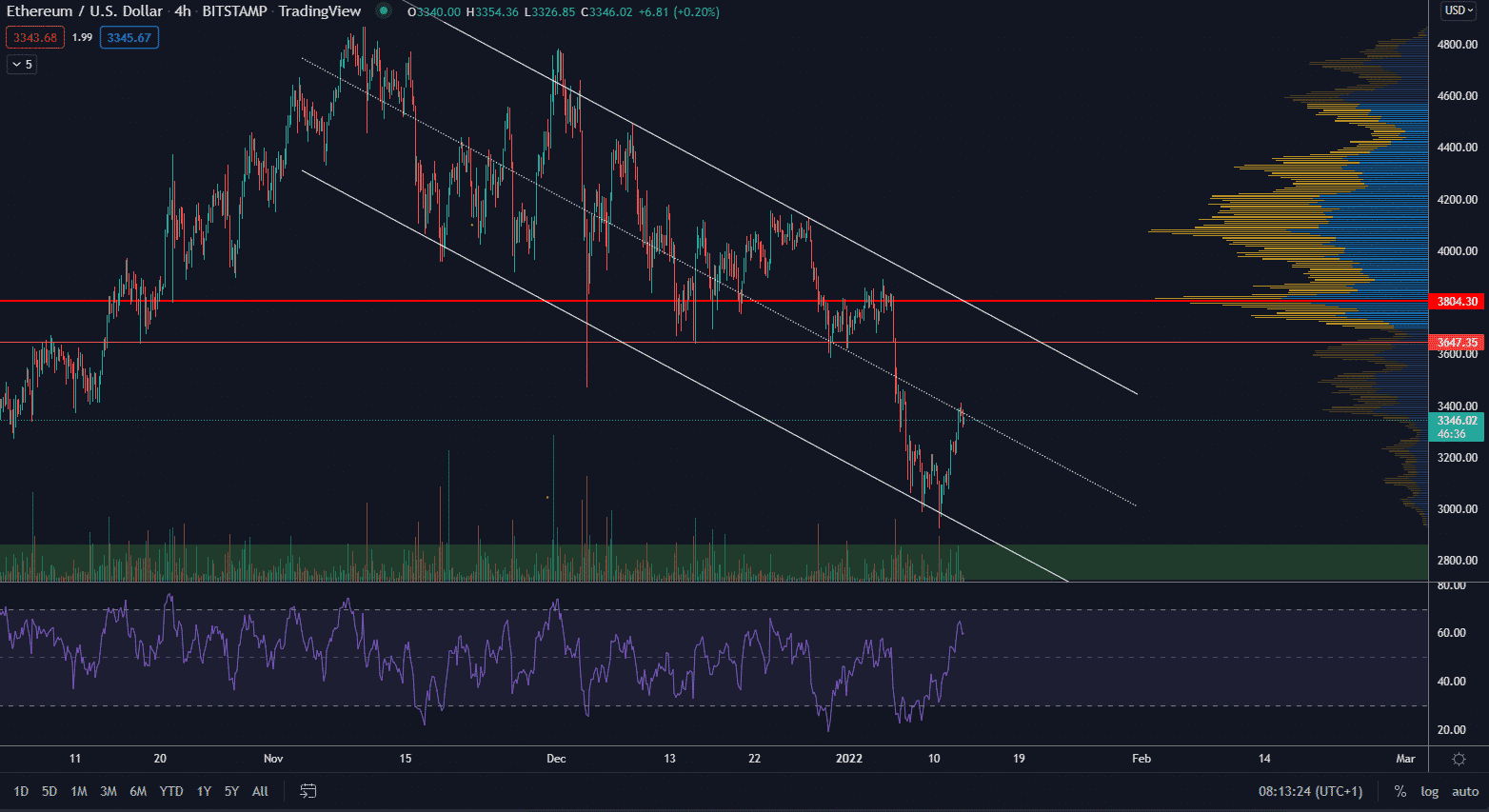 Trhová cena ETH sa momentálne nachádza v strede vlajky a z krátkodobého hľadiska tu môže vytvoriť lokálne maximum. Ak však bude rastúci trend pokračovať, rezistencia a target sa nachádzajú na hladine cca 3 650 $. Ide o dlhodobo významnú hladinu a okrem toho sa v tejto zóne nachádza aj rezistencia samotnej vlajky.