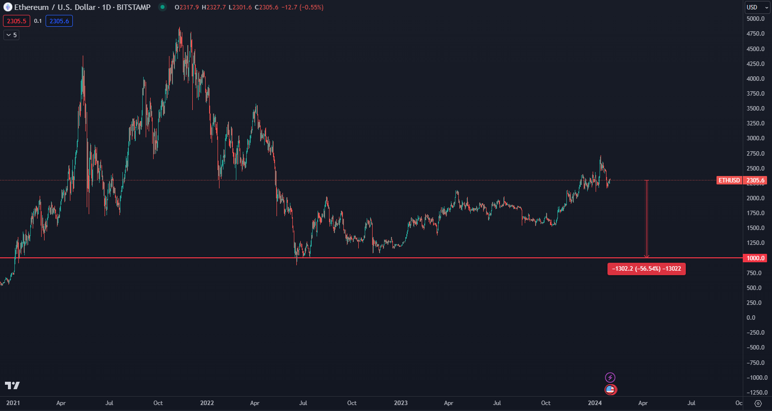 Cowen vysvetlil, že Ethereum vždy spätne testovalo minimá cyklov v rokoch 2015, 2016 a 2020 a myslí si, že to isté sa udeje aj s minimom z roku 2022. Ako prvý signál korekcie uvidíme prepad na obchodnom páre ETH/BTC. Následne cena Etherea klesne aj v dolárovom vyjadrení. Tento scenár má údajne nastať do niekoľkých mesiacov v roku 2024.