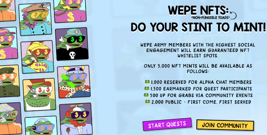 Novinkou je aj NFT kolekcia pre držiteľov WEPE. Tvorcovia pre nich pripravili 5 000 zberateľských kúskov, ktoré dostanú najaktívnejší členovia. Môžete sa tak zapojiť do WEPE Armády a za odmeny plniť rôzne výzvy.