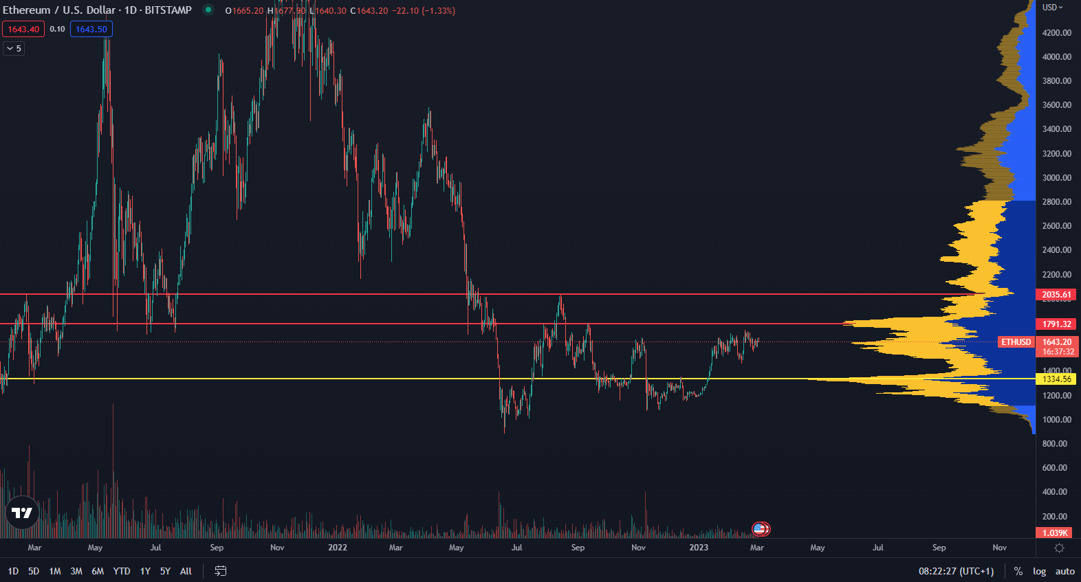 Na obrázku sú znázornené dve kľúčové rezistencie na hladinách 1 790 a 2 035 dolárov. Ak ich cena prekoná, pravdepodobne by akumulačná zóna bola ukončená a ethereum by mohlo začať nový rastúci cyklus. Samozrejme, na trh vplýva posledné roky mnoho nepriaznivých makroekonomických faktorov, ktoré môžu potlačiť dopyt, no samotné sieťové údaje etherea naznačujú skôr opačný scenár. Ak sa viac zaujímate o analýzu etherea, odporúčame vám prečítať si článok Údaje naznačujú, že ethereum môže narásť až 10-násobne.