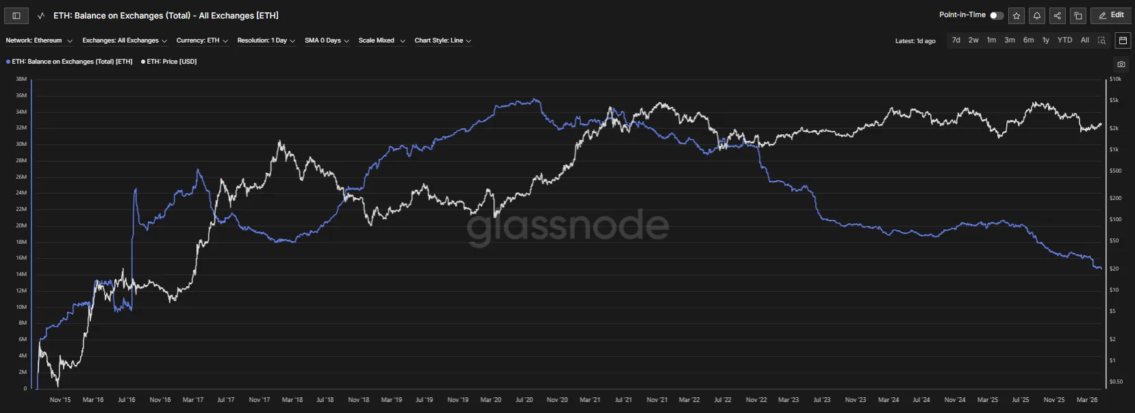 Ethereum predstavuje v súčasnom digitálnom svete kľúčový pilier decentralizovaných financií, pričom aktuálne pohyby jeho on-chain dát naznačujú zásadnú zmenu v trhovej dynamike. Glassnode uvádza, že množstvo mincí dostupných na burzových adresách dosiahlo kritické úrovne, ktoré sme naposledy sledovali pred 10 rokmi. Tento trend odzrkadľuje hlbokú transformáciu vnímania hodnoty aktíva, kde investori uprednostňujú bezpečnú úschovu mimo centralizovaných platforiem pred okamžitým obchodovaním na trhu.