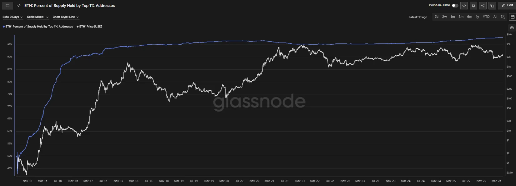 Znamená to extrémnu koncentráciu majetku, kde takmer celú zásobu mincí vlastnia veľkí hráči a inštitúcie, čo dramaticky znižuje množstvo Etherea dostupného pre bežných obchodníkov.
