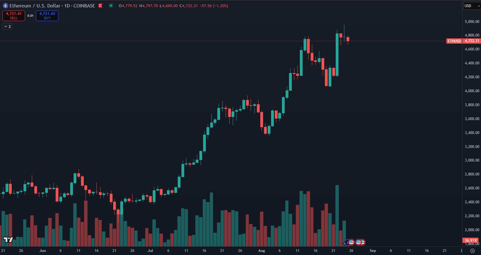 Okrem prekonania Mastercard v trhovej kapitalizácii dosiahlo ETH aj nové historické maximum na úrovni 4 955 dolárov, ukazujú údaje z TradingView. V súčasnosti sa obchoduje okolo 4 722 dolárov, pričom za posledných 24 hodín klesla cena o -1,30 %. Za týmto nárastom stáli aj vyjadrenia predsedu Federálneho rezervného systému USA o možných zníženiach úrokových sadzieb, ktoré podporili optimizmus na celom kryptotrhu.