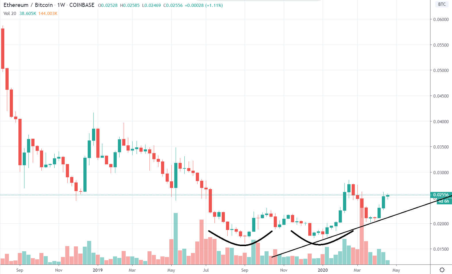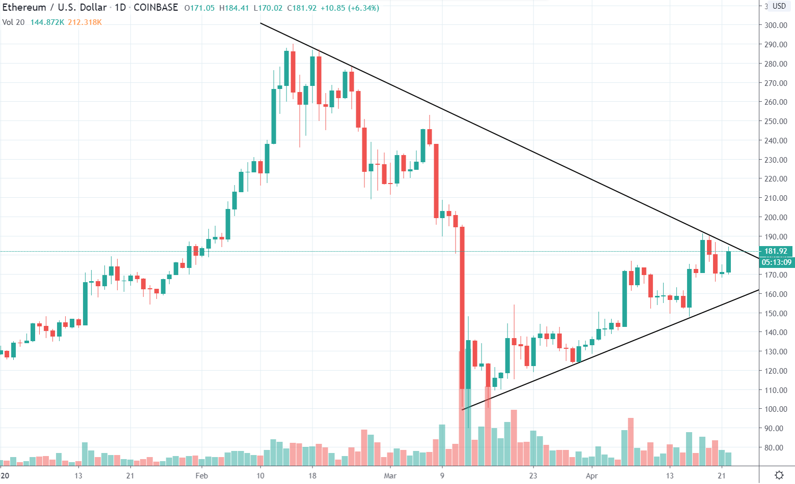 To však bolo len chvíľkové zaváhanie a Ethereum sa rýchlo vrátilo späť. Aktuálne sa obchoduje za 182 $ (Coinbase Pro) a lokálne high má ešte o niečo vyššie – 192 $. Týmito výkonmi výrazne prekonáva Bitcoin a dokonca vykazuje známky otáčania trendu.