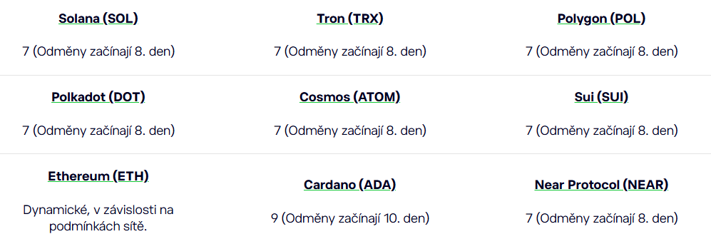 Väčšina odmien začína od 8. dňa po zapojení, Cardano od 10. dňa a Ethereum poskytuje dynamické odmeny podľa podmienok siete. Staking umožňuje pasívne zhodnocovanie držených aktív priamo na účte eToro bez potreby technického nastavenia alebo samostatného uzamknutia kryptomien, pričom platforma zabezpečuje automatické pripísanie odmien. Táto služba je vhodná pre investorov, ktorí chcú profitovať z držania kryptomien dlhodobo.