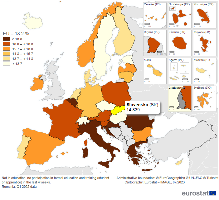 Najnovšie údaje Eurostatu ukazujú, že až 18 % ľudí vo veku 15 až 64 rokov v Európskej únii (EÚ) nepracuje ani neštuduje. Slovensko je niekde v strede priemeru EÚ s hodnotou 14,84 %. Najhoršie je na tom Rumunsko (25,76 %), Taliansko (25,63 %) a Grécko (22,79 %). Naopak, najnižšie hodnoty sú vo Švédsku (8,31 %), Estónsku (12,27 %) a Švajčiarsku (13,33 %).