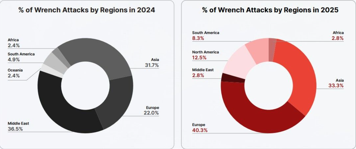 Európa sa stala najohrozenejším regiónom pre kryptodržiteľov, pričom predstavuje viac než 40 % všetkých incidentov, čo je výrazný nárast oproti 22 % v roku 2024. CertiK zaznamenal 72 overených fyzických útokov a únosov v roku 2025, pričom počet únosov vzrástol o 66 % a fyzických útokov dokonca o 250 %.