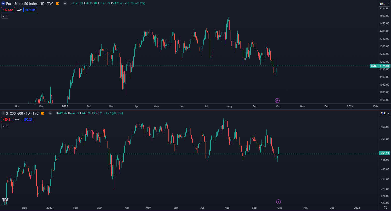 Paneurópsky index STOXX Europe 600 stratil za september 2,1 %, zatiaľ čo index blue-chipov z eurozóny EuroStoxx 50 za september oslabil o 3,51 %. Rovnako klesol za posledný mesiac aj nemecký akciový index DAX o 3,42 % a francúzsky CAC 40 o 3,23 %.