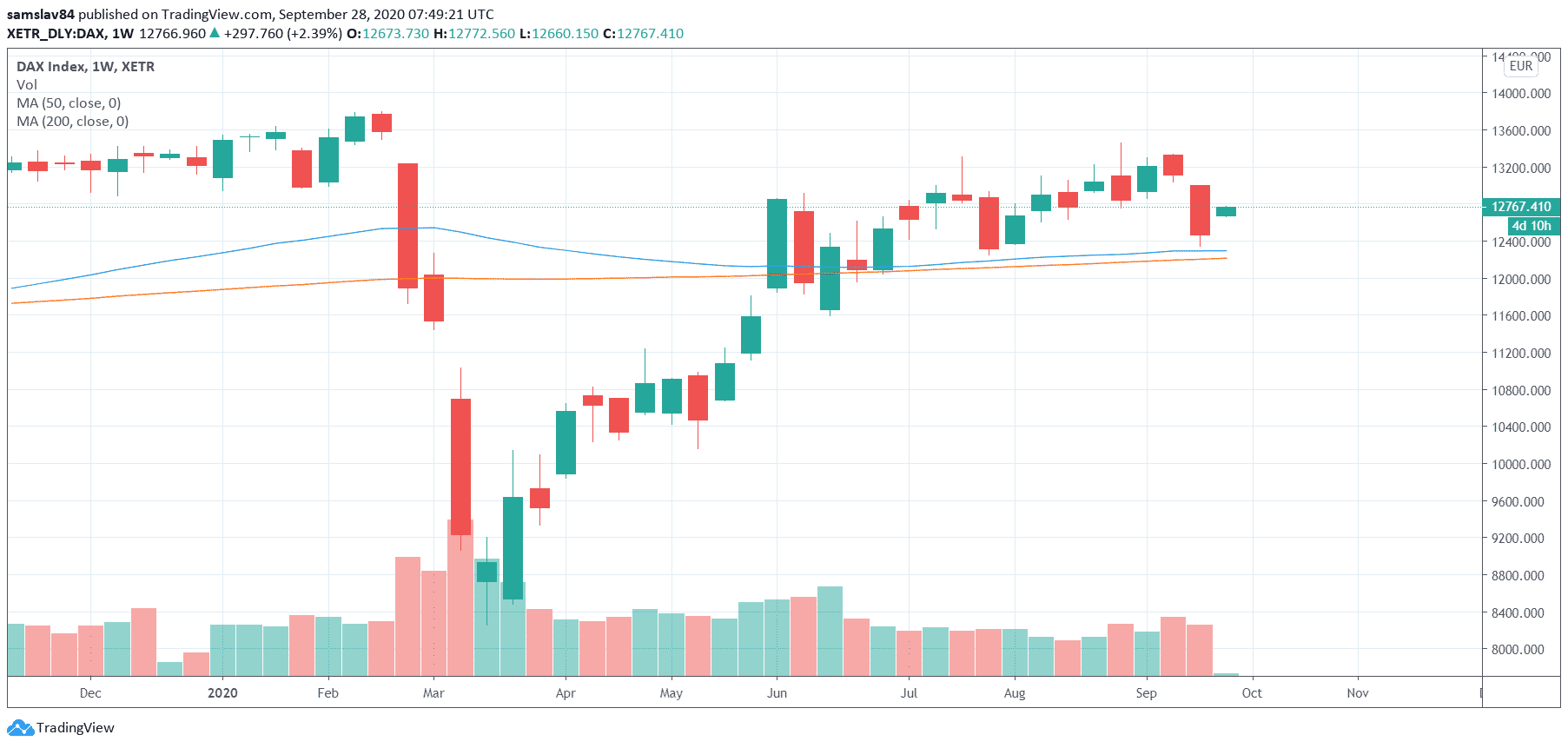 Tento rast sa dal očakávať, akcie totiž majú za sebou veľmi nepríjemný týždeň. Naposledy sme tak vysokú červenú weekly sviecu na DAXe zaznamenali na začiatku júna a predtým počas marcovej paniky okolo koronavirusu.