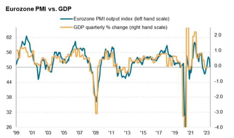 Údaje z prieskumu indexu purchasing managers index (PMI) HCOB Flash Eurozone, ktorý zverejnila spoločnosť S&P Global naznačujú, že v júni došlo k poklesu z hodnoty 52,8 na 50,3. Ekonomický rast tak spomalil tesne nad hodnotu 50 bodov, čo je definované ako hranica vzostupu. Francúzsko zaznamenalo v júni najslabší výkon v eurozóne, zatiaľ čo v Nemecku sa rast takmer zastavil.