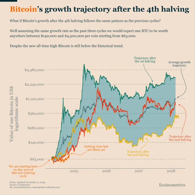 Analytik poznamenal, že súčasná rastová trajektória Bitcoinu zostáva pod historickým priemerom v obdobiach po halvingu. Napríklad po prvom halvingu v roku 2012 cena Bitcoinu vzrástla o 8 447 % v priebehu roka.
