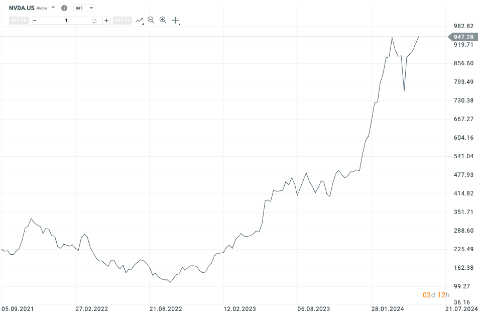 Vzhľadom k výraznému rastu v posledných mesiacoch sú však akcie pre niektorých investorov menej dostupné (aj keď vďaka zlomkom to u väčšiny maklérov neplatí), a Nvidia preto oznámila rozdelenie akcií (tzv. stock split) v pomere 1:10. Ak by si akcie spoločnosti Nvidia zachovali svoj dnešný rast, trhová kapitalizácia by dosiahla zhruba 2,4 bilióna dolárov. Len pre porovnanie, najväčšou spoločnosťou na svete je v súčasnej dobe Microsoft s 3,2 bilióna dolárov a druhou spoločnosťou je Apple s 2,9 bilióna dolárov.