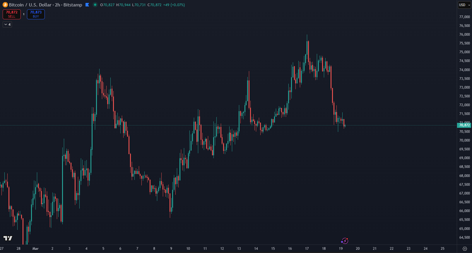 Hoci kryptomena zažívala pôsobivý osemdňový rast, realita trhu priniesla rýchle vytriezvenie. Práve 17. marca 2026 narazil Bitcoin na tvrdú hranicu odporu vo výške 76 000 dolárov. Napriek pozitívnej nálade obchodníci túto úroveň neudržali a cena následne skĺzla až na súčasných 70 800 dolárov, ukazujú údaje z TradingView. Tento prepad schladil optimizmus o okamžitom odpojení od tradičného finančného systému.