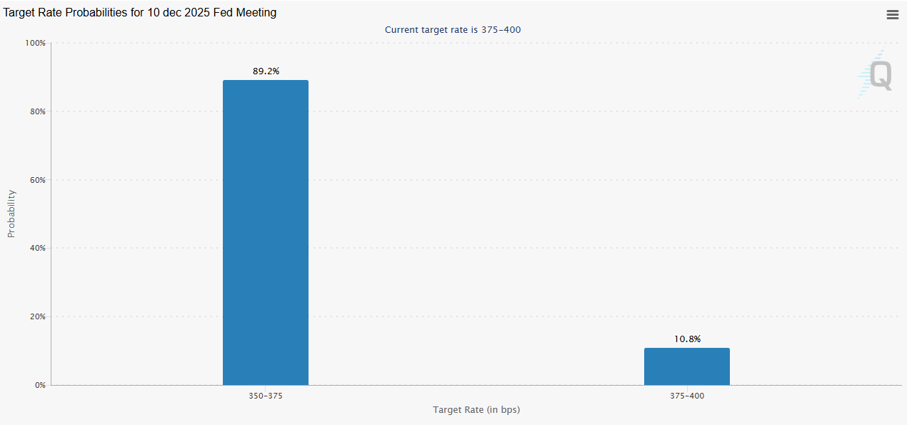 Čo sa týka akciového indexu S&P 500, Lee odhaduje hodnoty 7 200 až 7 300 bodov počas decembra. Všetka pozornosť sa sústreďuje na decembrové zasadnutie FOMC, kde sa očakáva jasné smerovanie budúceho znižovania úrokových sadzieb. Ak sa FED rozhodne pre zníženie sadzieb, mohlo by to ešte viac podporiť trhy a zvýšiť investičný apetít pre rizikové aktíva. Podľa CME Group 89,2 % investorov verí v zníženie o 25 bodov.