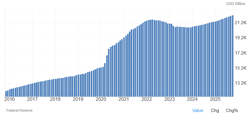 Peňažná zásoba M2 v USA dosahovala v októbri 2025 22 298,10 miliárd dolárov. Tento nárast poukazuje na pokračujúcu expanziu likvidity v ekonomike. Historicky M2 rástla od rekordného minima 286,60 miliárd dolárov v januári 1959 a priemerne dosahovala 5 635,97 miliárd dolárov. Súčasná úroveň predstavuje historické maximum a odráža rastúce množstvo peňazí v obehu, čo môže ovplyvniť infláciu a investičný trh, uvádza TradingEconomics.