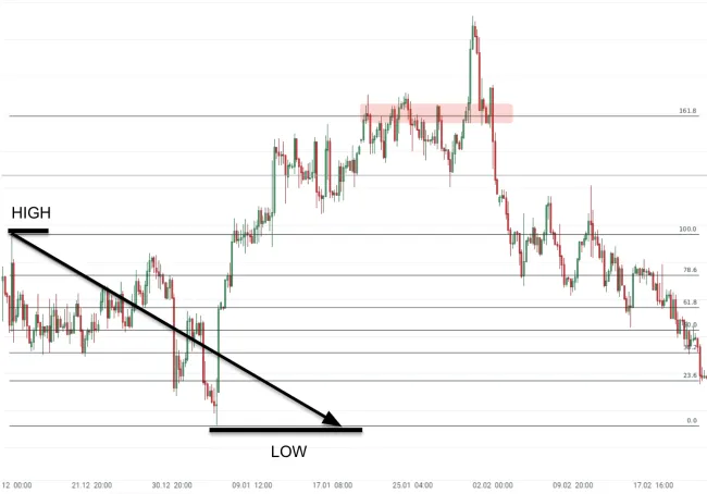 Retracement môže byť tiež rozšírený na vonkajšie pásma, ktoré môžu obchodníkovi pomôcť čiastočne uzavrieť obchod – ako na obrázku nižšie, konkrétne sa tu jedná o zónu (červený obdĺžnik) 1,618 násobku pôvodného vstupného retracementu, označenú HIGH – LOW.