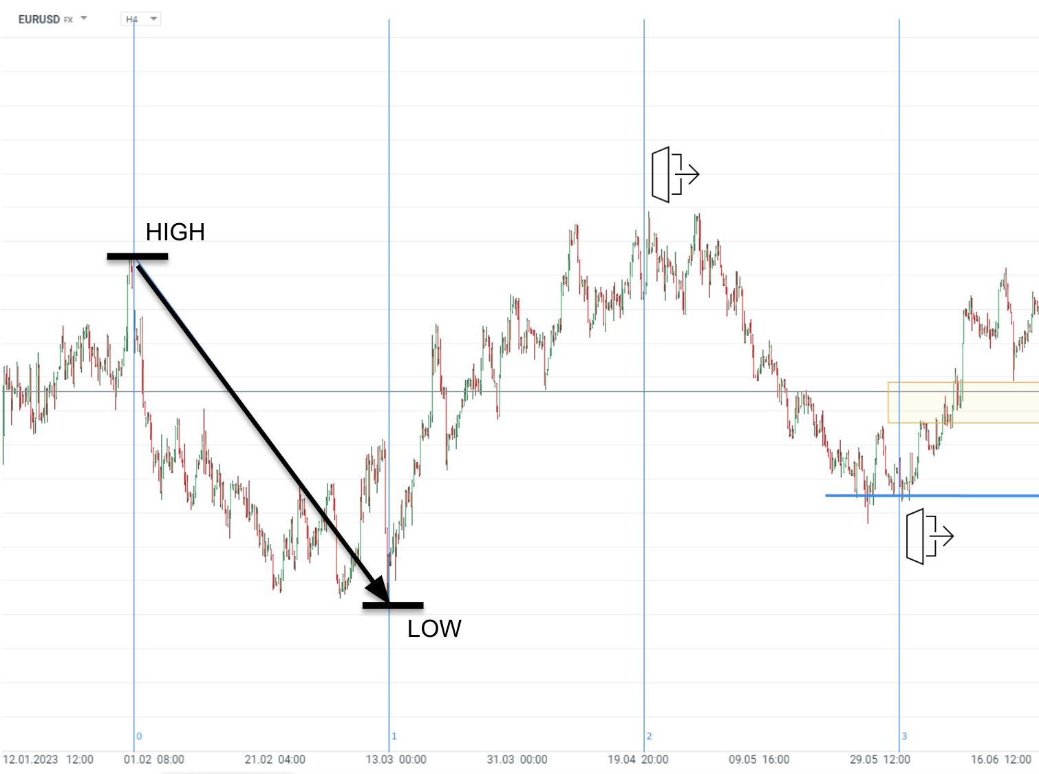 Spočiatku by mal obchodník predovšetkým hľadať a sledovať impulzívny pohyb – dva prípady znázornené modrou šípkou na obrázku vyššie. Takýto pohyb je charakterizovaný silnou sviečkovou formáciou, buď rastúcou, alebo klesajúcou s minimálnou alebo žiadnou korekciou. Následne obchodník vyčkáva na „stiahnutie trhu”, do ktorého vstúpi počas korekcie. V tomto prípade sa jedná o pásma vyznačené oranžovo, po ktorých nasleduje vstup v smere predchádzajúceho impulzu. Môžeme tiež pracovať s viacerými fibo pásmami, ako v našom príklade. Nie je tiež na škodu vytvoriť si vlastné pomery na základe vášho riadenia rizika.