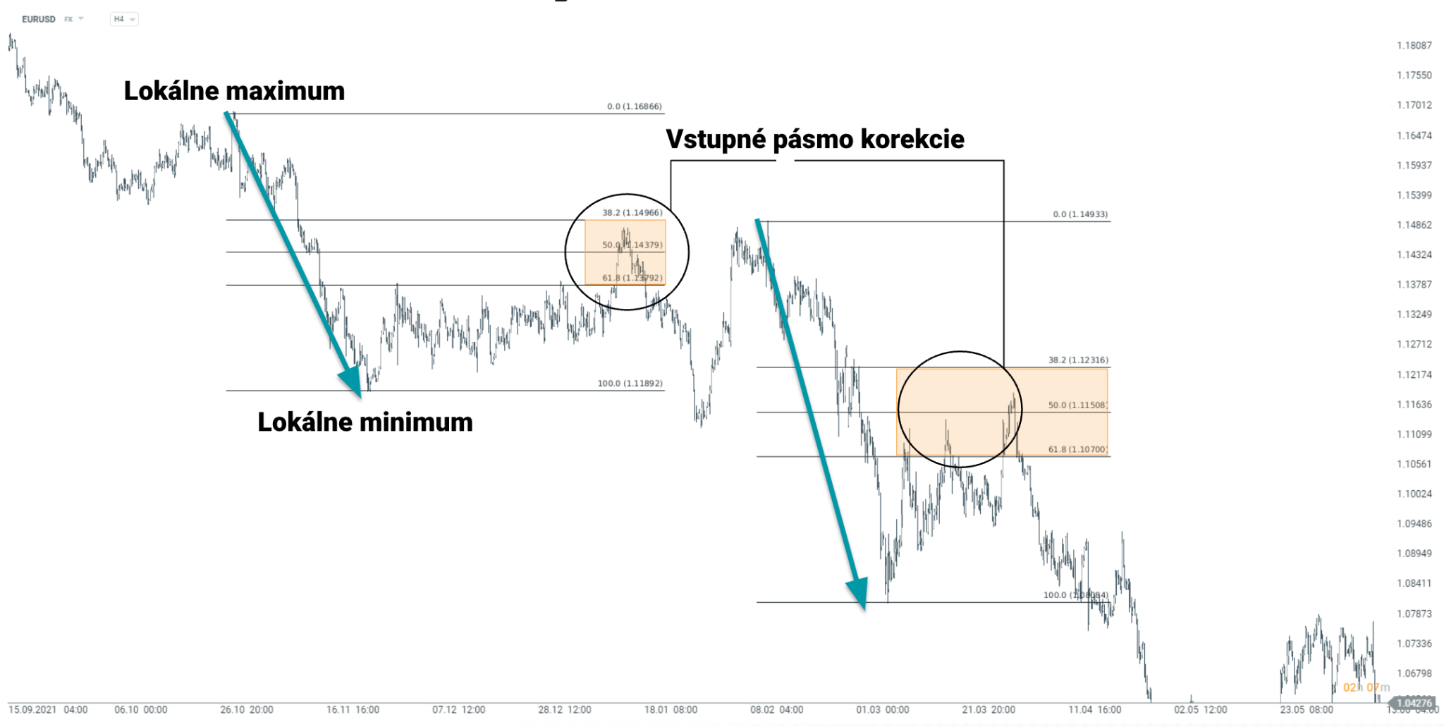 Fibonacciho retracement v klesajúcom trende. Zdroj: Platforma xStation 5