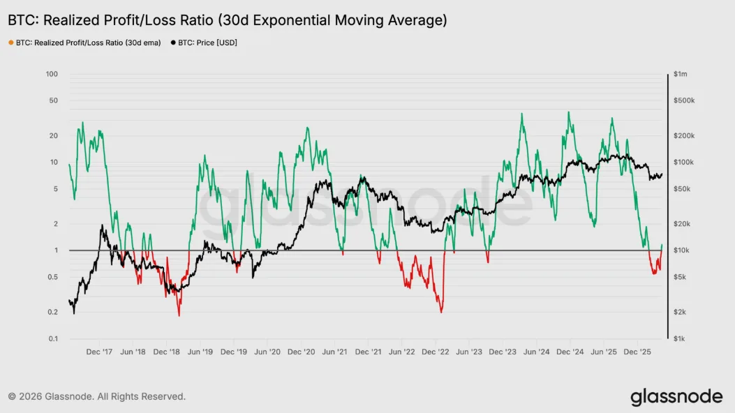 Dlhšie časové hľadisko vyžaduje skúmanie rovnováhy medzi realizovanými ziskami a stratami naprieč celou investorskou základňou. Pomer realizovaného zisku a straty nad úrovňou 1 jasne signalizuje dominanciu realizácie ziskov nad stratami. Aktuálny údaj 1,16 potvrdzuje, že ľudia široko využívajú súčasný odraz ceny ako príležitosť na odchod z trhu na úrovni nuly alebo s miernym ziskom.