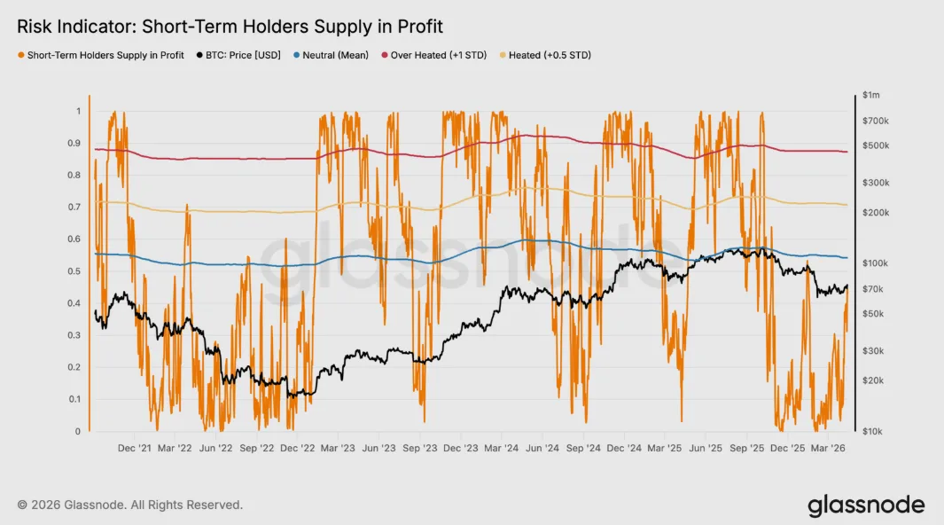 Metrika percentuálneho podielu ponuky krátkodobých držiteľov v zisku meria objem mincí nadobudnutých v poslednom období, ktoré ich majitelia aktuálne držia v nerealizovanom zisku. Tento ukazovateľ slúži ako priamy faktor tlaku na predaj zo strany nových účastníkov. Historické dáta ukazujú, že lokálne vrcholy počas klesajúcich trendov vznikajú v momente, keď táto hodnota dosiahne štatistický priemer približne 54,2 %. V tomto bode koncentrácia ziskových držiteľov vyvoláva vlnu distribúcie.