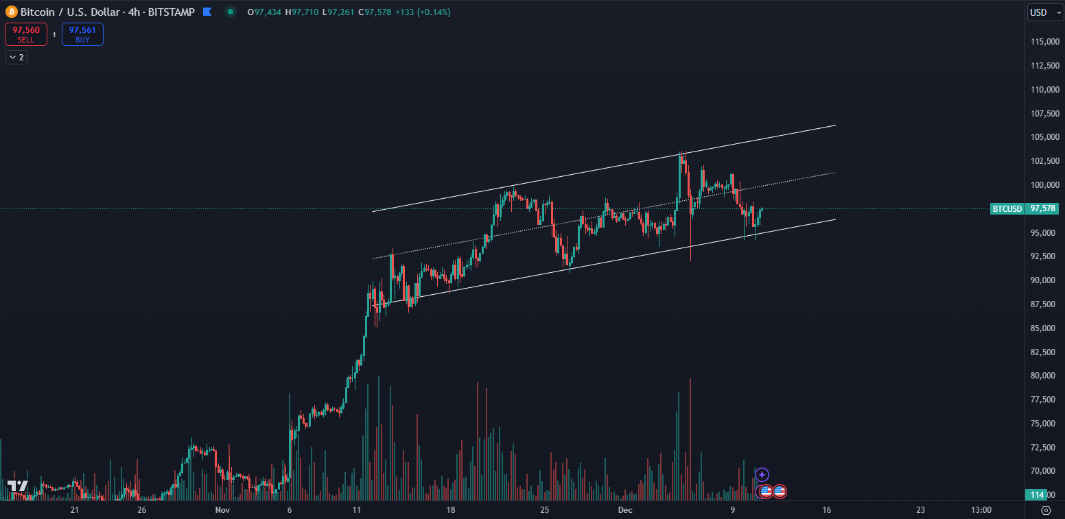 Ako môžeme vidieť na grafe od TradingView, Bitcoin nesignalizuje cenovú korekciu. Tá ale môže udrieť každou chvíľou. Cena sa pohybuje od polovice novembra v mierne rastúcej vlajke, zatiaľ čo altcoiny v tomto období doslova explodovali a vytvorili rekordné zhodnotenie. Nastala tak situácia, v ktorej zisky Bitcoinu výrazne poklesli a zvyšné altcoiny stúpali o stovky percent.
