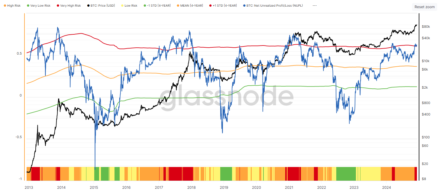 Metrika čistého nerealizovaného zisku/straty (NUPL) od Glassnode kvantifikuje celkový zisk alebo stratu držanú na trhu ako percento trhovej kapitalizácie. To poskytuje pohľad na psychologický stav trhu vzhľadom na veľkosť nerealizovaného zisku alebo straty. NUPL je kategorizovaná do štyroch úrovní rizika, pričom v súčasnosti sa nachádza v červenej zóne.