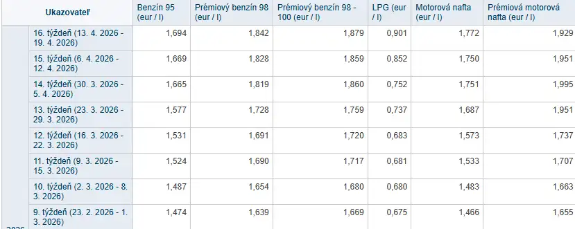 - Benzín 95 stál v 9. týždni 1,474 eura za liter, no v 16. týždni už 1,694 eura za liter.