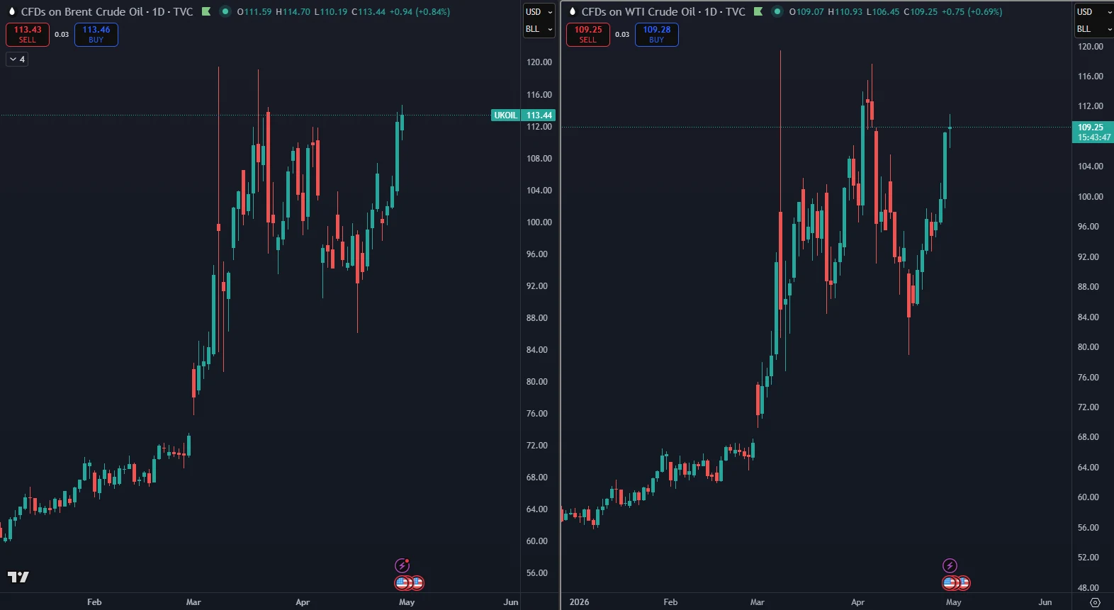 Ropa Brent sa vyšplhala na 113 dolárov za barel a WTI sa obchoduje okolo 109 dolárov za barel. Z grafov jasne vidieť, že nedávny pokles bol úplne vymazaný a trh sa vrátil na rekordné čísla, aké sme naposledy videli v roku 2022, keď vypukla vojna na Ukrajine. Vtedy ceny ropy tiež prudko vzrástli v dôsledku geopolitickej nestability a obáv z výpadku dodávok. História sa tak opakuje, tentokrát s epicentrom na Blízkom východe.