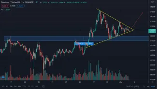 Na 1H grafe nižšie môžeme vidieť, že ADA formuje symetrický trojuholník, ktorý môže ísť hore aj dole. Aktuálne však vidíme na hodnotách medzi 1,15 – 1,2 USD silný support, ktorý bol najprv rezistenciou. Tá sa však po silnom pohybe hore zmenila na support. ADA v rámci triangla 2x otestovala tento support, pričom rýchlo nastal odraz späť hore.