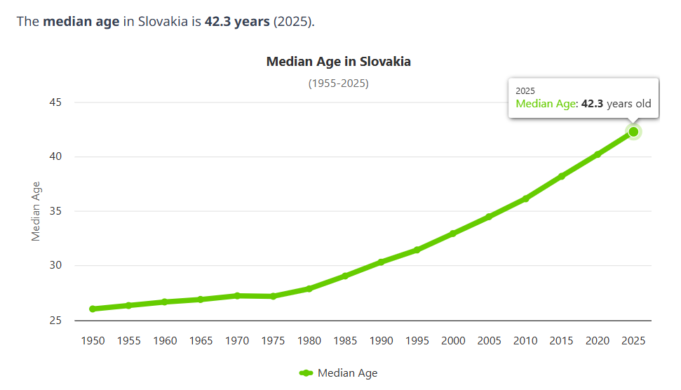 Na základe údajov Worldometers je medián veku obyvateľov Slovenska v roku 2025 na úrovni 42,3 roka. Pre porovnanie, v roku 1950 bol medián len 26 rokov a v roku 1990 30,3 rokov. Ide o dramatické zrýchlenie starnutia populácie. Za posledné desaťročia sa medián zvyšuje približne o dva roky každých 5 rokov, čo jasne odhaľuje, že Slovensko starne rýchlejšie, než dokáže reagovať akákoľvek reforma.