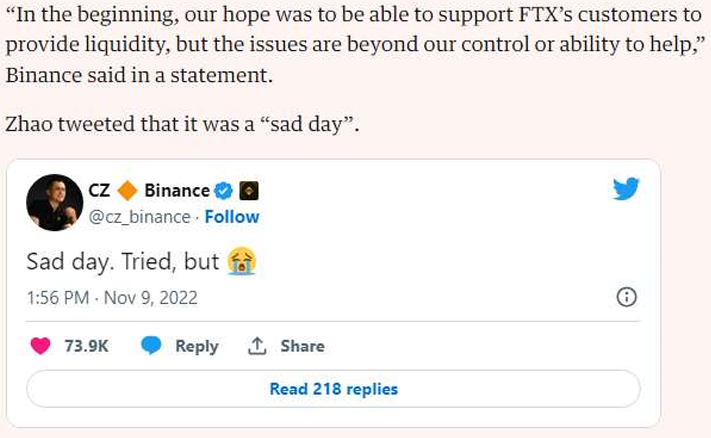 Žaloba obsahuje chronologicky usporiadané tweety od Changpeng Zhaa a informácie o znížení hodnoty tokenu FTT o 14 % len za jediný deň. Tweety mali cielene poškodiť entity, ktoré boli priamo napojené na burzu FTX. Riaditeľ burzy Binance vysvetlil, že nemá žiadne obavy, pretože nemal v úmysle niekoho poškodiť.