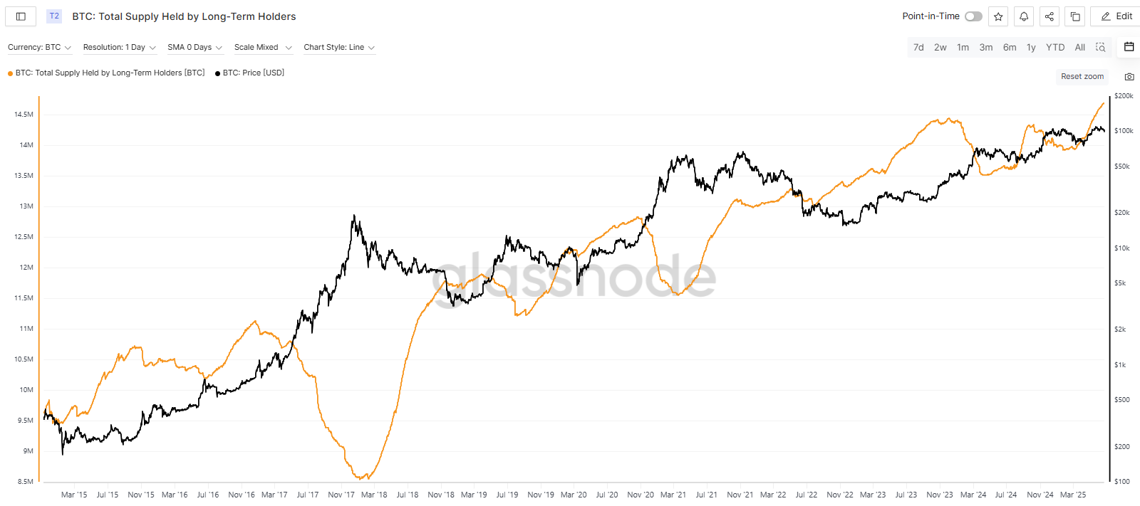 Bitcoin držaný dlhodobými držiteľmi je na vrchole